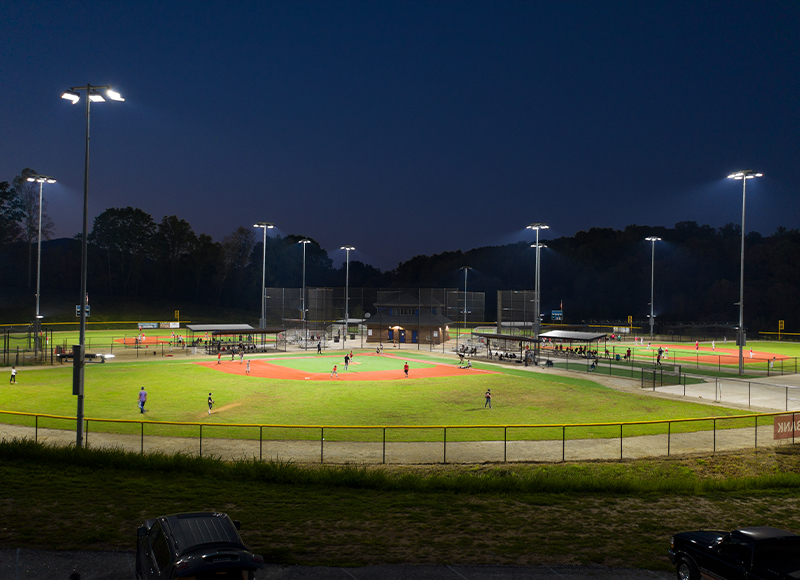 After several years of planning and permitting, construction began in the Fall of 2016 and Bob Lewis Ballpark officially opened in July 2018. With a total of seven baseball and softball fields, the new facility has been a welcome addition to the community. Bob Lewis Ballpark quickly became known as Western North Carolina’s premier location for regional baseball and softball tournaments. As demand began to increase, however, field use remained limited to daylight hours. The ballpark wanted to include high-quality LED lighting so tournaments and practices could run later into the evening. It needed a system that featured advanced glare and spill control as well as trouble-free operation.
