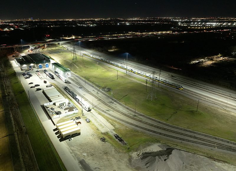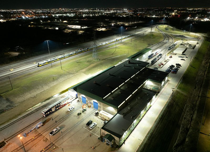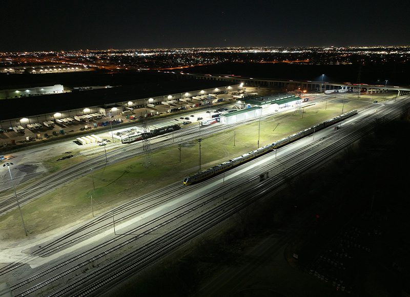 Trinity Railway Express (TRE) is a commuter railroad jointly operated by DART and Trinity Metro (Fort Worth). In 2022, Trinity found that inadequate light levels created a critical safety and security risk for personnel at their equipment maintenance facility. Trinity and DART partnered with NEMA 3 Electric to find a high-quality LED lighting system that could increase visibility along the tracks, walkways, parking lots, and other priority areas of the nearly 20-acre facility. It was also important the new system keep glare and light spill at a minimum, and that it be budget-friendly and reliable—like the railway itself, which serves about 1 million passengers each year.