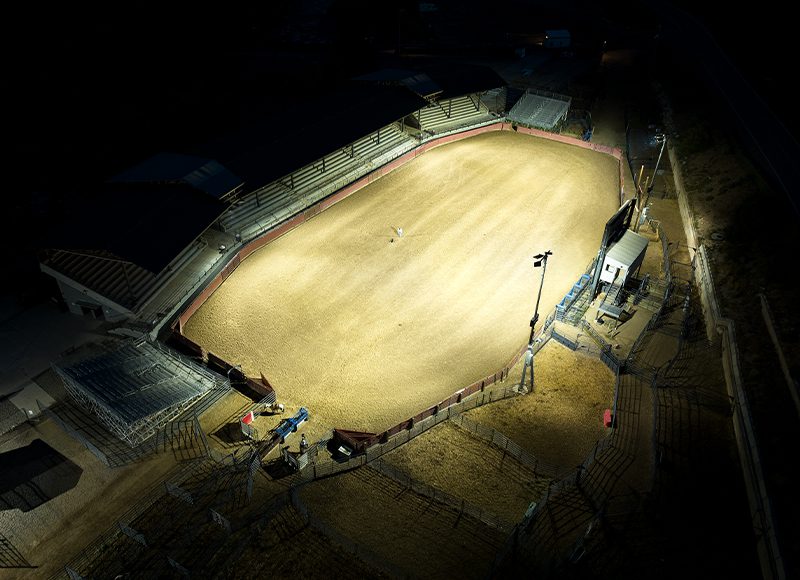 Horses working in the main arena at the Eagle County Fair and Rodeo after upgrading arena lights to Musco’s TLC for LED® system.