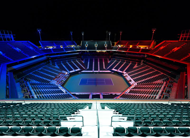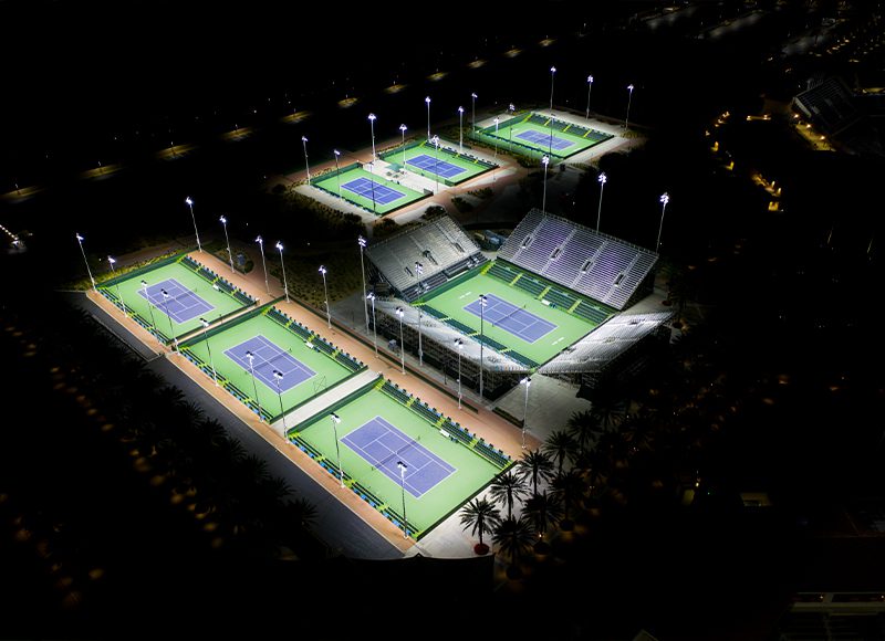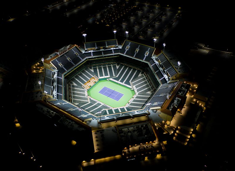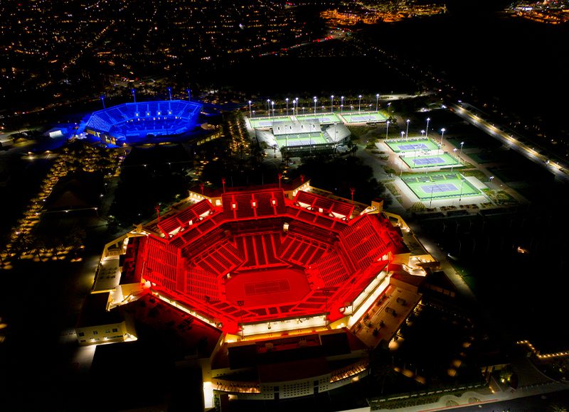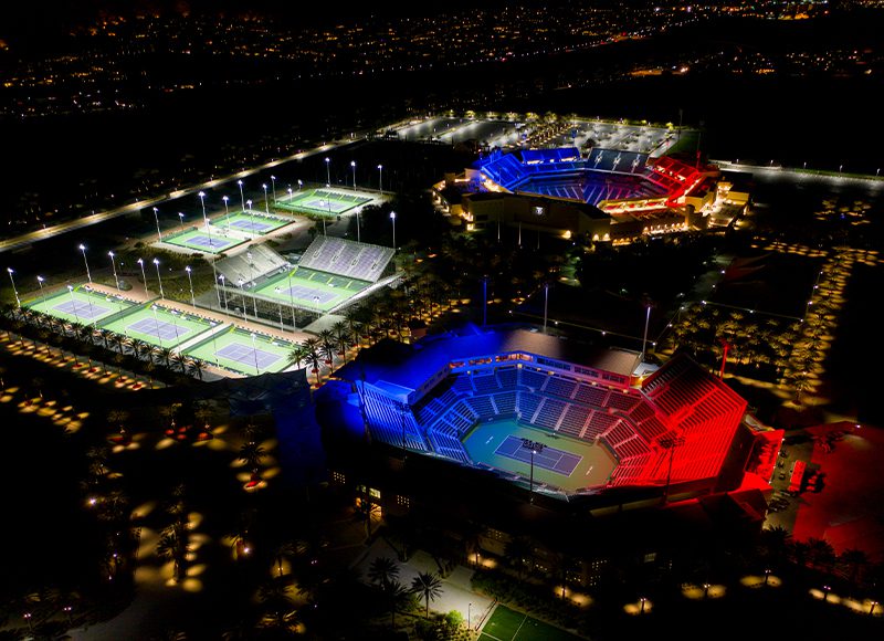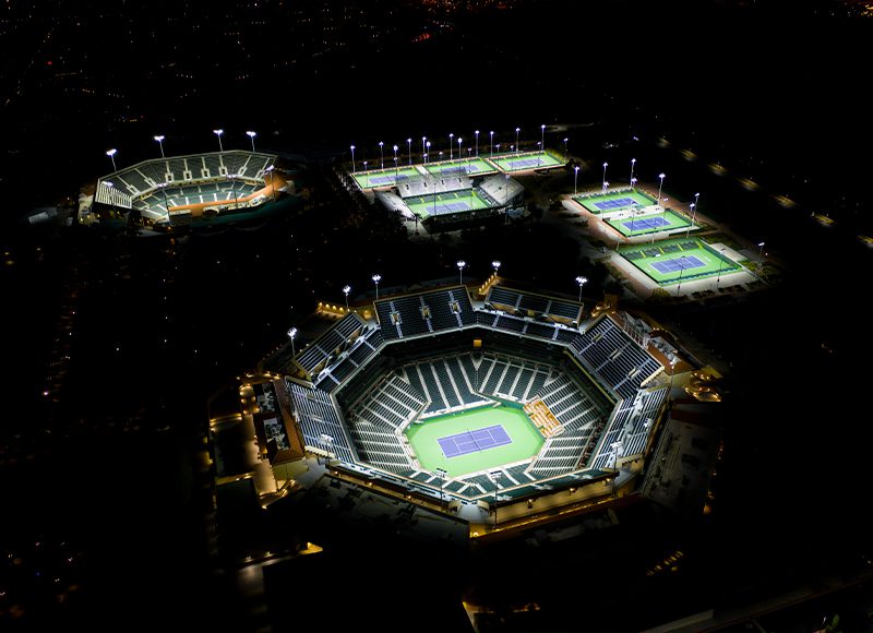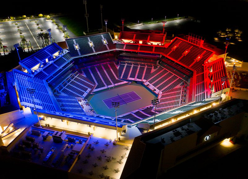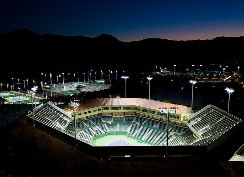 Since opening in March of 2000, Indian Wells Tennis Garden has established itself as one of the most revered and entertaining venues in professional tennis. Facility leadership recently made efforts toward modernizing this tennis paradise by initiating a lighting project that would bring highly-advanced LED technology to both stadiums and seven additional courts used for larger competitions. Goals for the new lighting were to produce greater light levels that would improve visibility both on the courts and for television broadcasts. Facility leaders were also interested in including the latest special effects technology to enhance the entertainment experience at competitions and events.