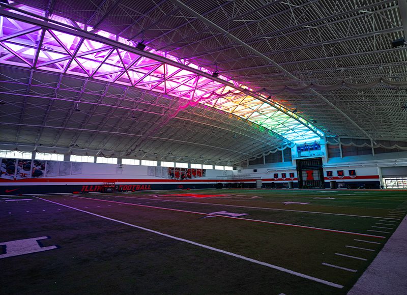 As part of an effort to upgrade its athletic facilities, the University of Illinois had recently repainted and returfed its $12 million Irwin Indoor Football Practice Arena. To finish bringing the facility up to date, University staff wanted to upgrade to LED sports lighting that would not only provide superb illumination on the playing surface, but also create an environment that would stand out in the minds of prospective recruits. Project leaders had a vision of installing color-changing lights to wash the facility in school colors and perform spectacular light shows for visiting student-athletes. Ideally, any new system would also be easy to use and offer dependable support from the manufacturer.