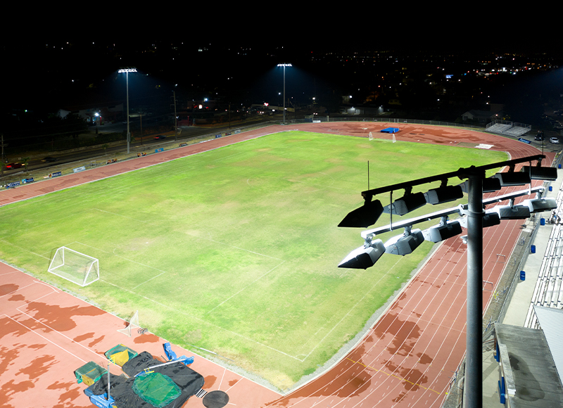 School leaders conducted extensive research into an array of lighting manufacturers, and after learning the capabilities of Musco’s TLC for LED® technology, they found their solution. The system delivers uniform light application to the track and field while minimizing glare and spill from affecting neighbors. And Musco’s 5 Easy Pieces™ complete system design provides superior structural support by stabilizing poles into the ground with a precast concrete base, which successfully endured an earthquake soon after installation.