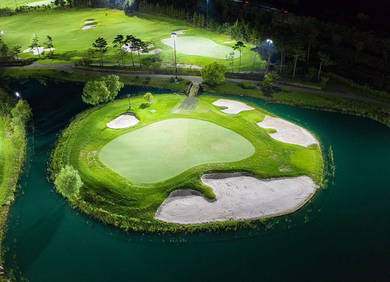 Golf green next to the water at Salt Bay Golf Club lit at night after LED upgrade.