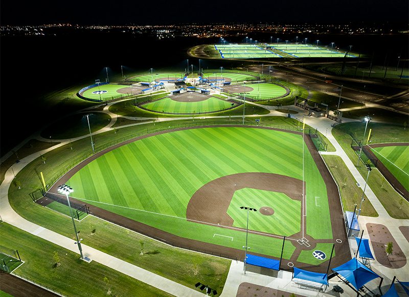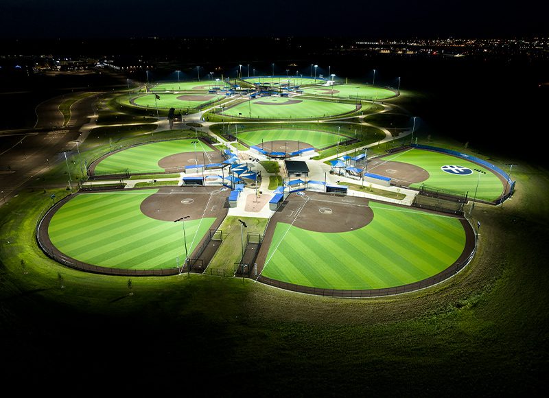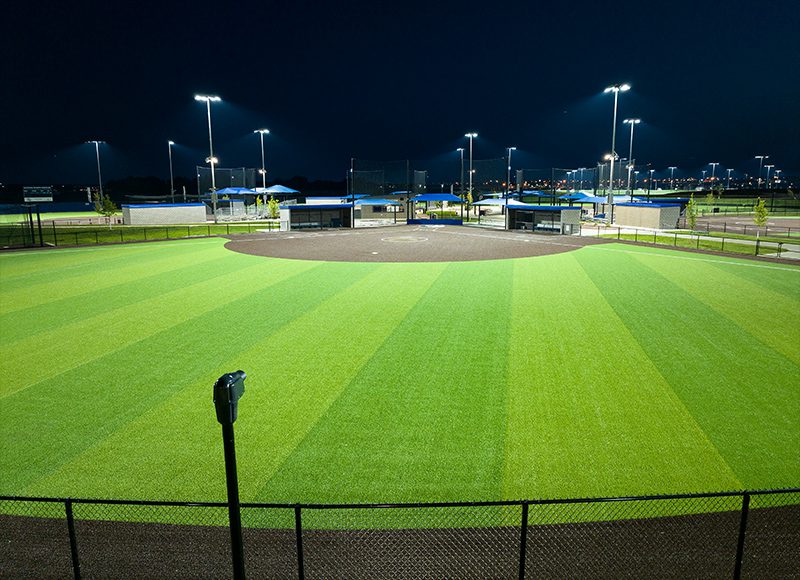 After evaluating potential partners, Sanford Sports chose to work with Musco and have its Light-Structure System™ with Total Light Control—TLC for LED™ technology installed on their newly constructed diamonds and fields. The system provides clean, even lighting for practices, training camps, games, and tournaments. Patented visoring technology minimizes glare and spill, protecting neighbors (including a nearby regional airport) and the night sky. Each of the facilities at The Diamond and The Crossing is equipped with MuscoVision™ automated sports broadcasting technology, making it possible for off-site fans and family members to watch sporting events in real-time via phone, tablet, computer, or SmartTV. The entire system is easy to control, with facility operators having the ability to operate the lights instantly with the touch of a phone, and is backed by Musco’s 24/7 service and support. A long-term parts and labor warranty eliminates any concerns about maintenance costs well into the future.