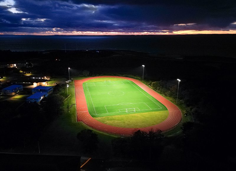 The lighting system distributes high-quality, uniform illumination across the field of play while keeping glare out of athletes’ eyes and preventing light from spilling beyond the edges of the property. Athletes from the university, high school, soccer leagues, and broader community can enjoy the facility without disturbing nearby wildlife, interrupting nature trail tours, or interfering with a local astronomical observatory.