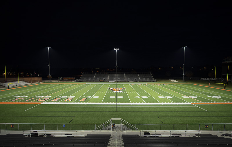 - The school district was able to realize additional savings on its new lighting by retrofitting the TLC for LED system with new structural cross arms onto the stadium’s existing poles.