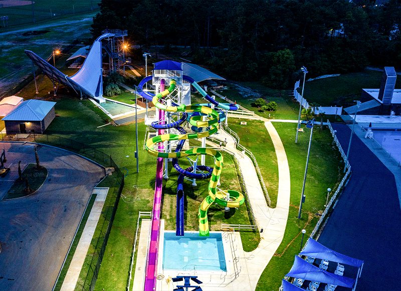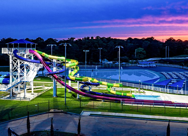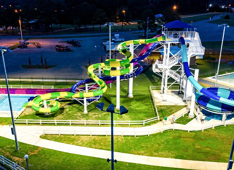 Once a military base, Westgate Park in Dothan, Alabama, is now home to Water World Water Park. To enhance fun and safety after dark, city leaders wanted to provide the best possible lighting on the park’s network of giant water slides, but they did not know what guidelines existed for this application. Project leaders reached out to engineering and architecture firm Barge Design Solutions for help finding a partner who could educate them on industry standards and design an LED water park lighting system to meet their needs. It was also important that the system be low-maintenance and backed by a reliable long-term warranty.